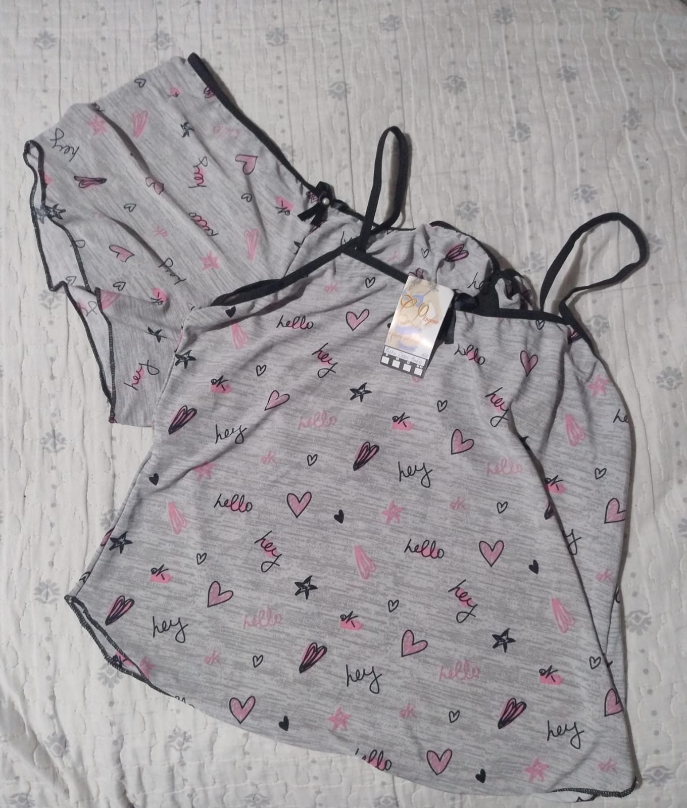 O conjunto é composto por blusinha de alcinhas reguláveis e shorts soltinho, garantindo liberdade de movimentos e frescor durante toda a noite.